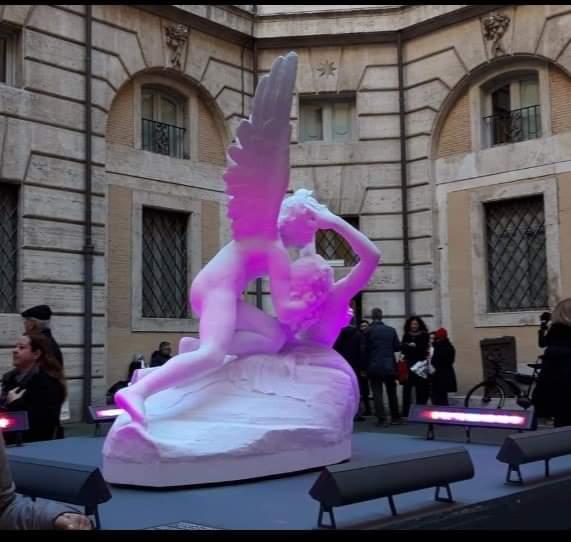 La statua del Canova è di una bellezza travolgente e gli sguardi “presi” dei due giovani amanti, appassionano.