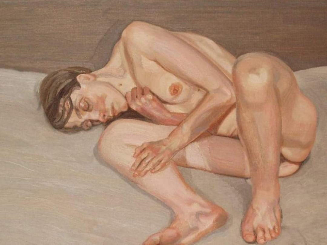 In “Piccolo ritratto nudo” Freud raffigura una giovane donna con i capelli castani e corti, che giace nuda, esposta e indifesa su un letto chiaro.