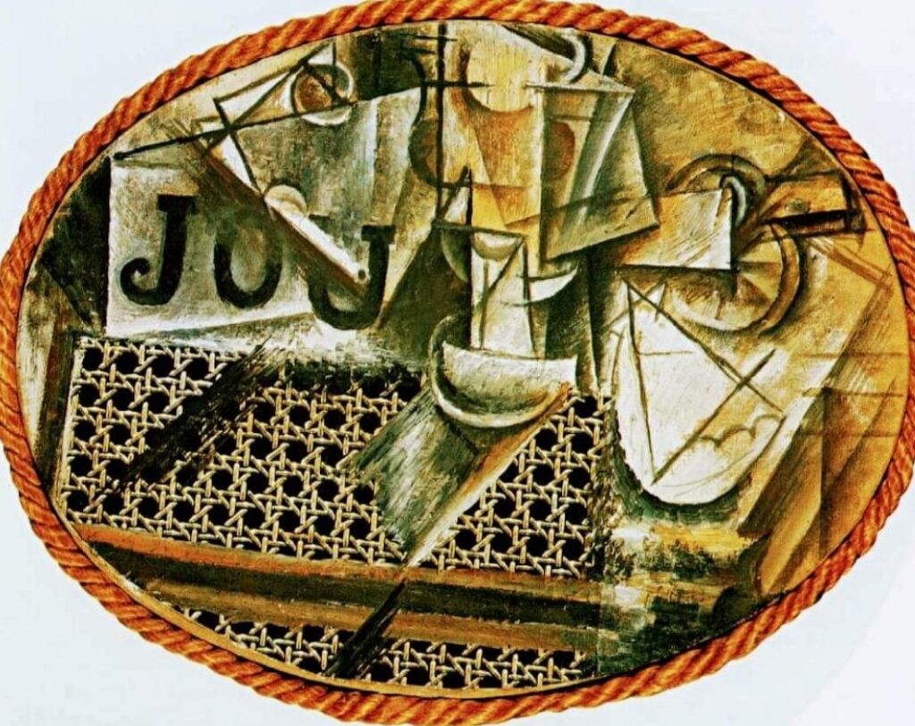 Picasso inizio ad introdurre ritagli di giornale, lettere, sabbia, foglie, come a creare un collage sul quadro, uno stile che si diffuse magicamente a macchia d’olio quasi a diventare una moda.
