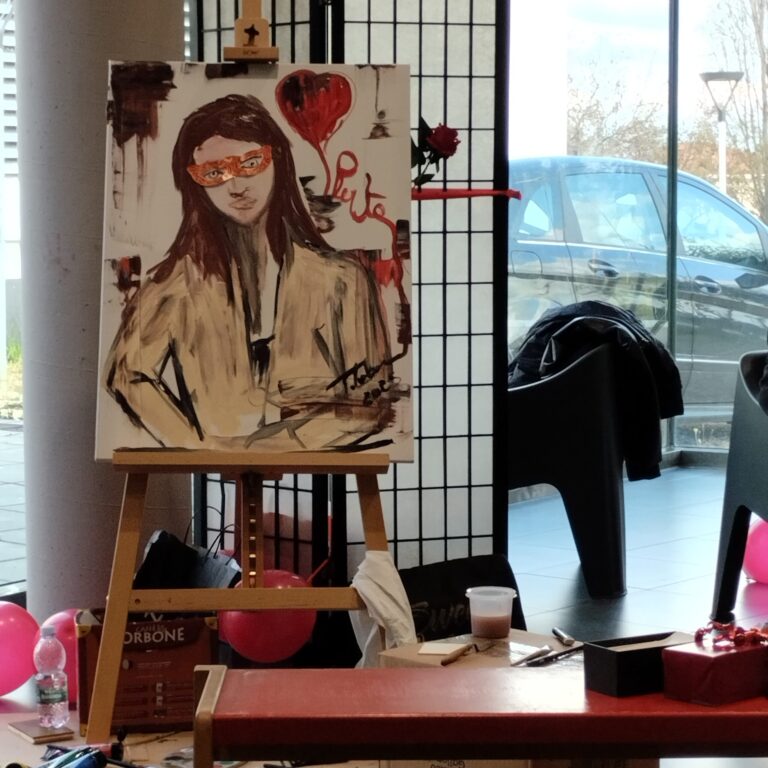 Coinvolgente, commovente e struggente è stata la performance della Professoressa Sonia Talarico che estemporaneamente e sulla note di Bollani ha impresso sulla tela il volto di una ragazza su cui ha posto alla fine una mascherina che aveva lei sugli occhi prima di iniziare. Questo gesto mi ha particolarmente colpito perché quella mascherina ha reso anonimo quel viso ma appunto perché sotto la mascherina, potrebbe essere il viso di qualunque donna.